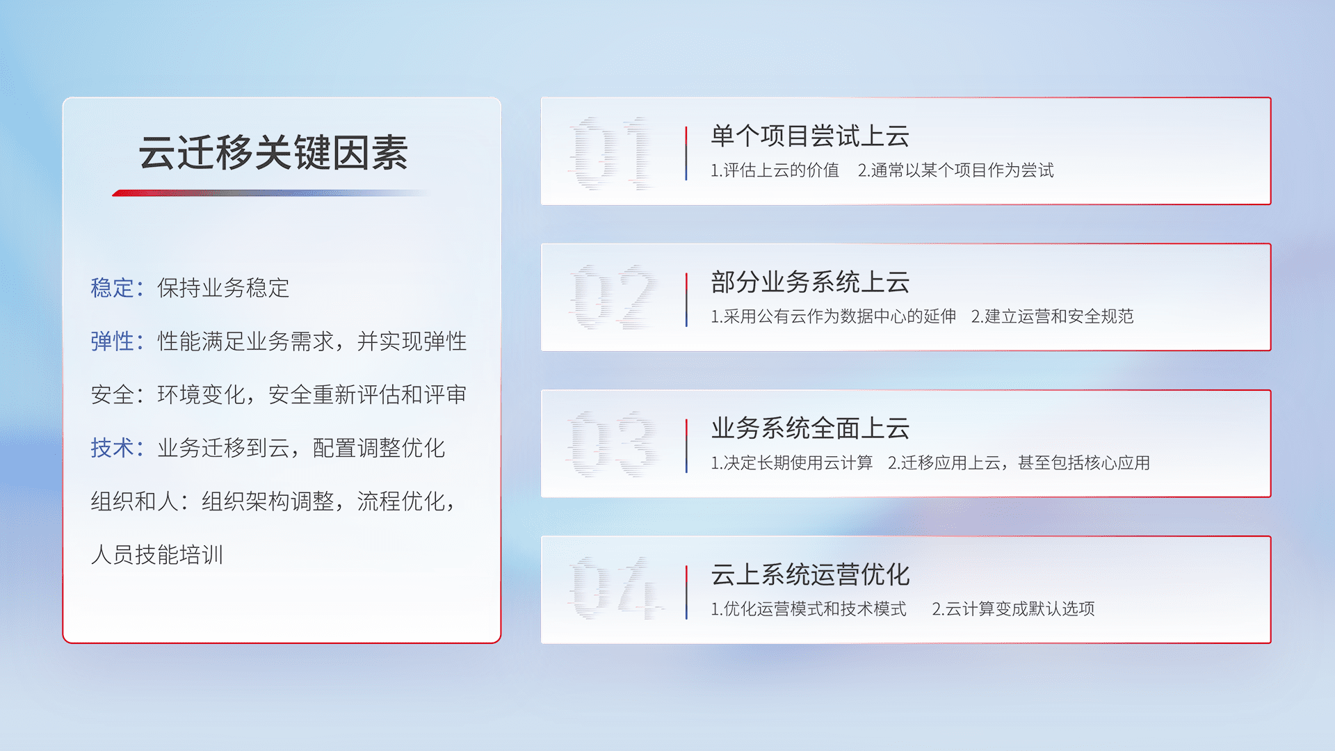 结合实际业务,,,从规划设计、、、云平台选型、、、、云原生改造、、、、数据迁移、、集成交付,,迁移全过程为客户识别最佳上云路径,,做好风险识别管理,,设计网络架构、、身份权限、、、安全审计合规、、、、操作审计、、、、日志审计、、、、监控告警策略、、、、多站点容灾设计等,,,,对云上基础设施进行整体规划,,,提升IT治理水平,,,,以满足弹性、、、、高可用、、高性能的需求。。。