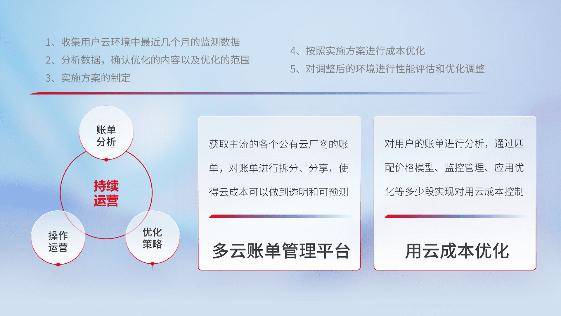 通过多云纳管,,,以统一的资源数据模型把客户的云资源进行抽象和封装,,进而实现对多云资源的统一操作,,,,保障云资源管理的可靠性、、稳定性与可用性。。。量身定制化运维内容,,配置、、、、开发运维、、、、补丁管理、、、、备份、、监控、、、认证和访问管理、、、审计和日常巡检等,,保障在用云过程中的可靠度,,,稳定度以及高可用率。。